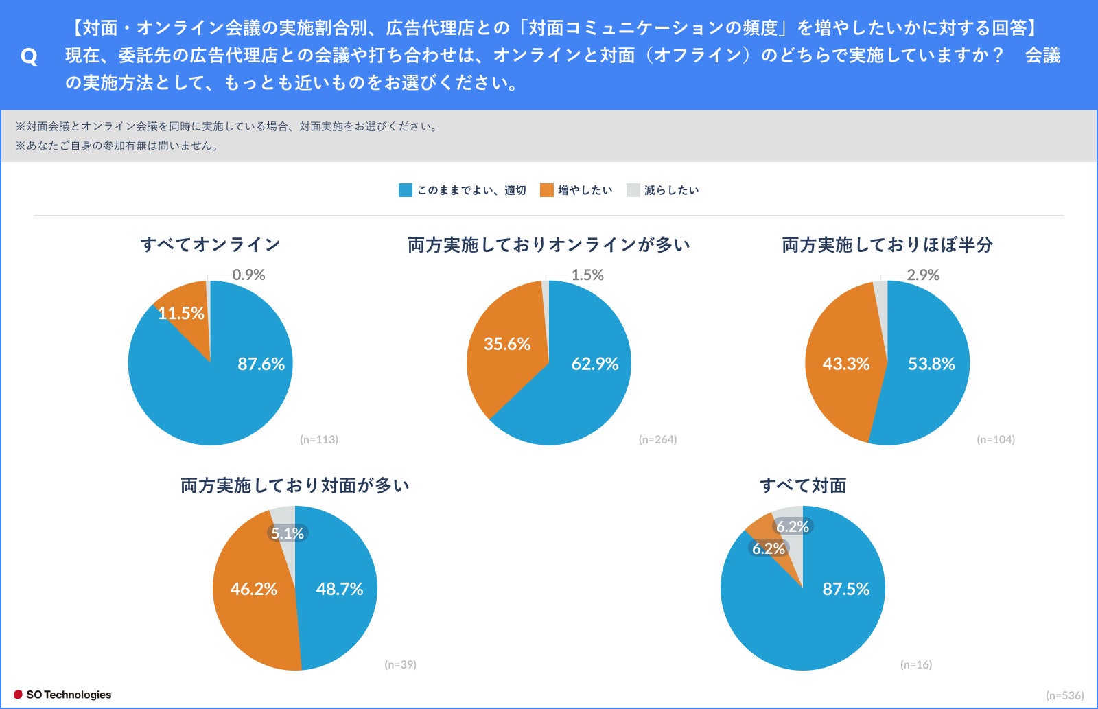 一方、対面(オフライン)での会議割合が多い広告主は、4割前後が対面会議の頻度を増やしたいと考えており、対面での会議・打ち合わせのニーズが一定数あることもわかりました。これは、直接顔を合わせることによる「ディスカッションが活発になりやすい」「些細な質問・相談がしやすい」「信頼関係が構築しやすい」などのメリットを広告主が認識しているためと考えられます。