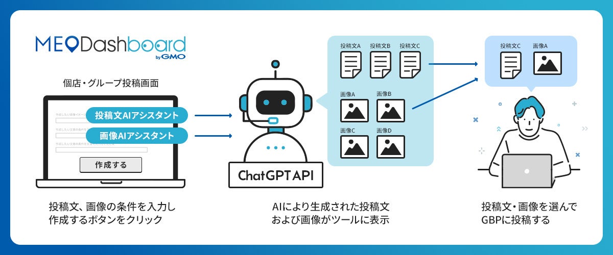 GMOインターネットグループでインターネット上の集客サービスを展開するGMO TECH株式会社(代表取締役社長CEO:鈴木 明人 以下、GMO TECH)は、MEO(※1)総合管理ツール「MEO Dashboard byGMO」において、OpenAI(※2)が提供するGPT-4を搭載した『AI投稿アシスタント機能 Powered by ChatGPT API』の提供を、2023年8月8日(火)より開始しました。