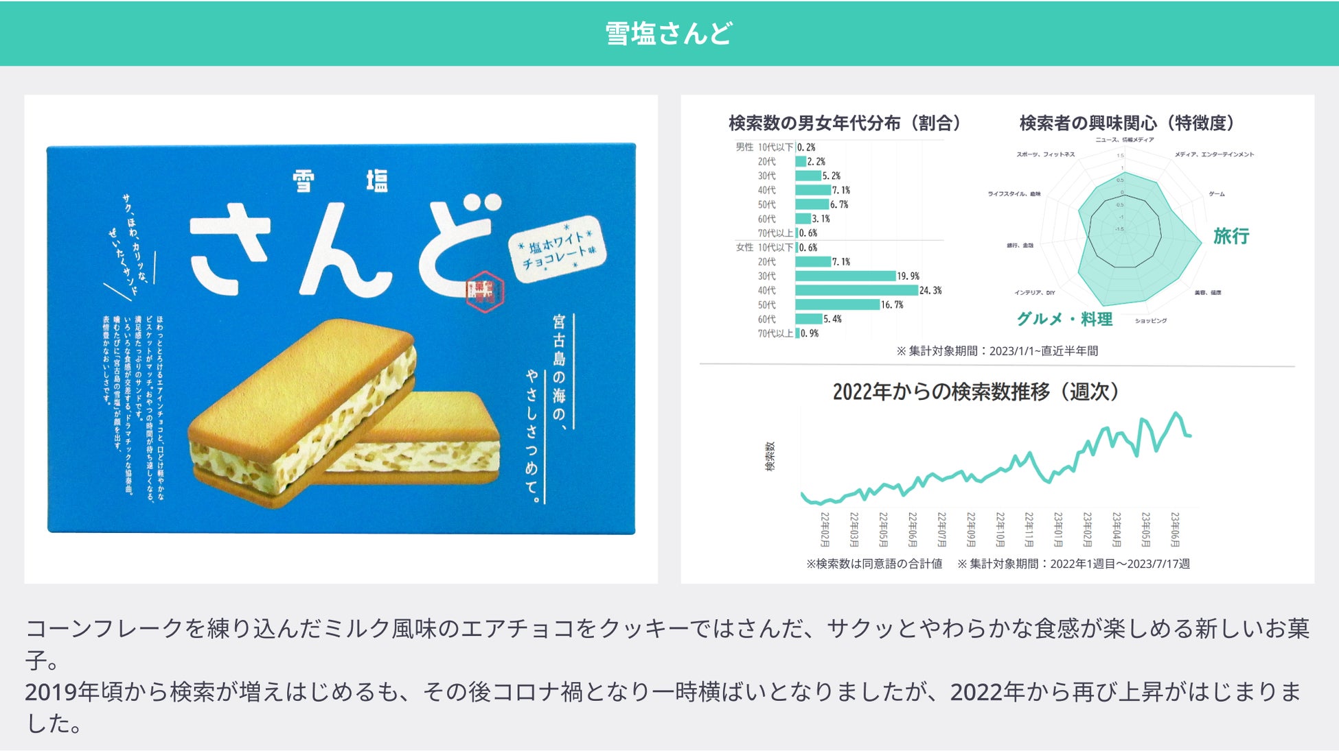 宮古島発のスイーツ「雪塩さんど」。“宮古島の雪塩”を使い、コーンフレークを練り込んだミルク風味のエアチョコをクッキーではさんだ、サクッとやわらかな食感が楽しめます。2019年頃から検索が増え始めた後、一時期は横ばいとなりましたが、2022年から再び検索数が上昇しています。