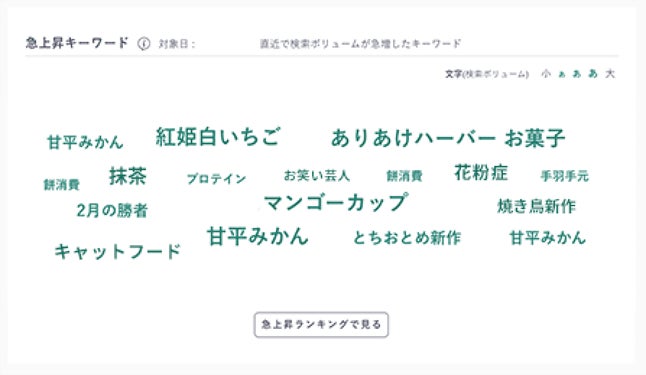 1日単位で検索ボリュームが急上昇したキーワードを表示します。トレンドマップとは異なり、突発的、または勢いがあるトレンドも多く出現します。前日話題になったトピックや、変化を早期に検知したい場合に有効です。