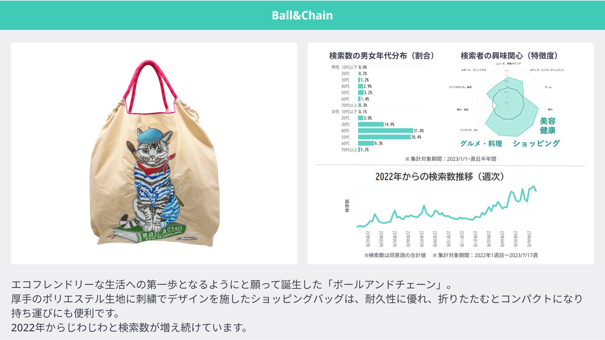 厚手のポリエステル生地を中心としたボディに、刺繍によるグラフィックワークが魅力的なバッグブランド。耐久性に優れ、折りたたむとコンパクトになり持ち運びにも便利です。2022年からじわじわと検索数が増え続けています。