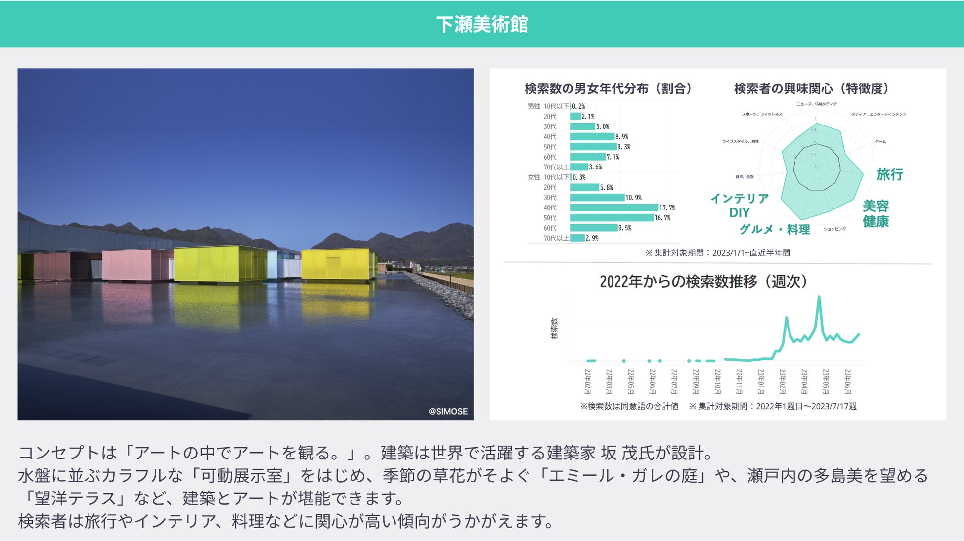 2023年3月に開館した下瀬美術館のコンセプトは、「アートの中でアートを観る。」。建築は世界で活躍する建築家 坂 茂氏が設計しました。水盤に並ぶカラフルな「可動展示室」をはじめ、季節の草花がそよぐ「エミール・ガレの庭」などが堪能できます。検索者は、旅行やインテリア、料理などに関心が高い傾向にあります。