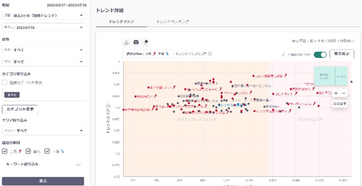 横軸に検索ボリューム(※4)、縦軸にトレンドスコア(※5)をとり、散布図形式で検索キーワードを可視化し、それぞれのキーワードが4つのライフサイクル(ネクストブレイクエリア、ブレイクエリア、ポテンシャルエリア、ブームエリア)のどの位置にいるのか確認できます。また、性年代の属性別、カテゴリ別、期間別(3カ月間または1年間)で可視化できます。