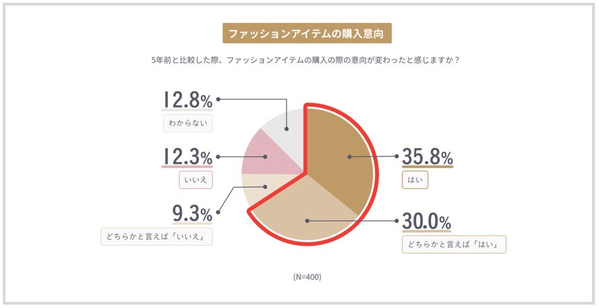 「ほぼ実店舗」と「どちらかというと実店舗」を合計すると53.05%で、過半数はファッションアイテムを実店舗の方で購入することが多いと回答。一方、「ほぼオンライン」「どちらかというとオンライン」をあわせると23.73%で、3割を切っています。この割合は男女別で見ても、ほぼ同じでした。