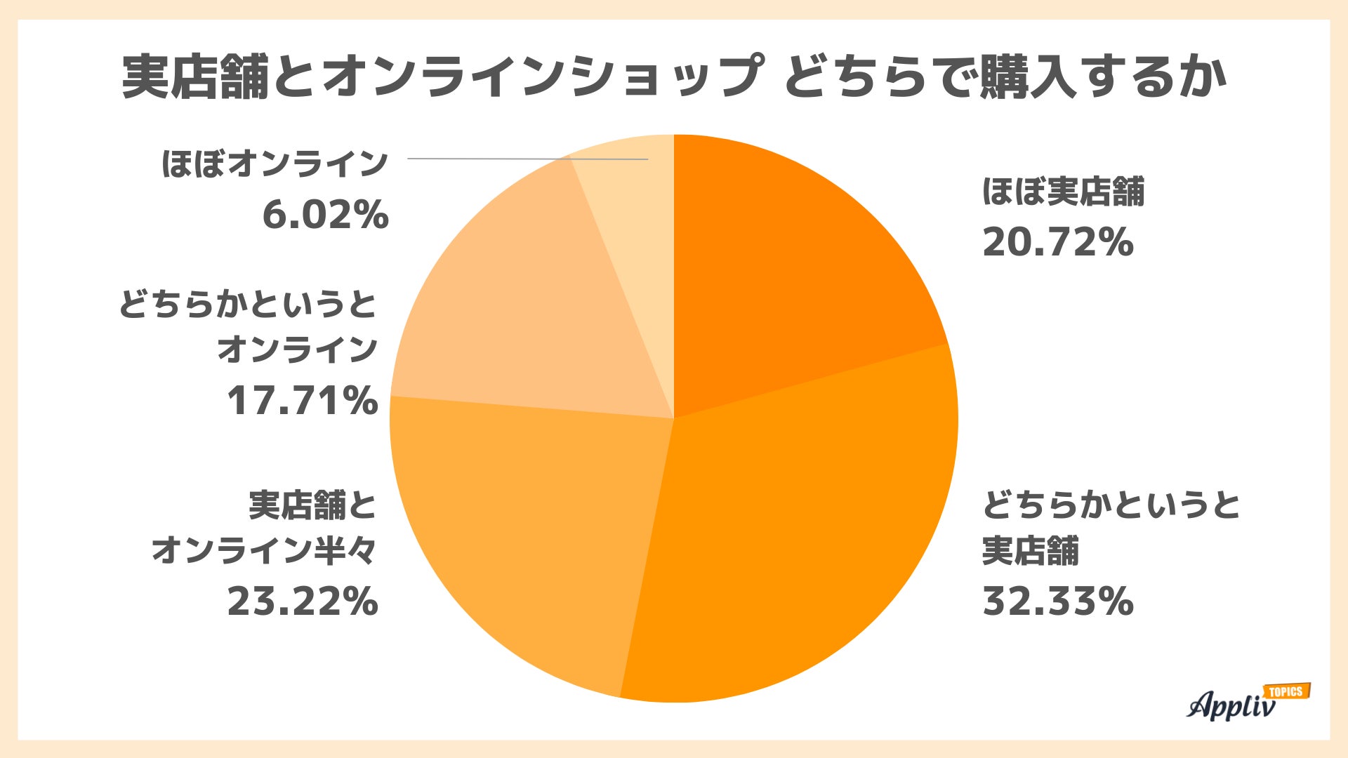 最多は「どちらかというと実店舗」32.33%、次いで「実店舗とオンライン半々」23.22%という結果でした。