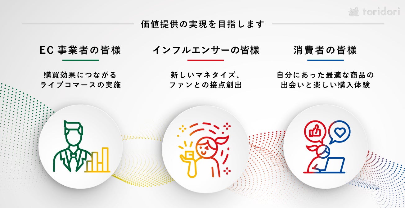 今後、2社は協働で、日本国内の通販事業者の皆様、そして日本進出を目指す韓国企業の皆様に対して、Grip Companyのソリューションを活用した"ライブコマースのノウハウ”およびtoridoriが培ってきた”インフルエンサーマーケティングのノウハウ”を提供してまいります。今回の業務提携を通じ、両社で下記の価値提供の実現を目指します。