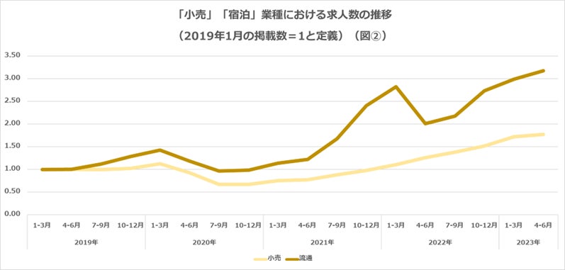 例年、7-9月期は、4-6月期と比べると転職活動が落ち着く傾向にあります。そのため、2023年7-9月期は転職希望者は減少すると予想します。一方で、急な人流回帰やインバウンド消費の影響を受けている小売・流通業界では、人手不足がますます深刻化しており、求人数は今後さらに伸びると予想します。
