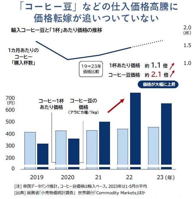 こうした環境にも関わらずカフェの倒産が相次ぐ背景には、原材料、特にコーヒー豆の価格高騰が影響している。国内に多く流通しているアラビカ種の価格は、2022年平均で1キロ700円を超え、300円台で推移したコロナ前に比べると約2倍に高騰した。食材価格や電気・ガス代、アルバイトなどの人件費も上昇している一方、提供するコーヒー1杯への価格転嫁は遅れており、利益が出しにくくなっている。