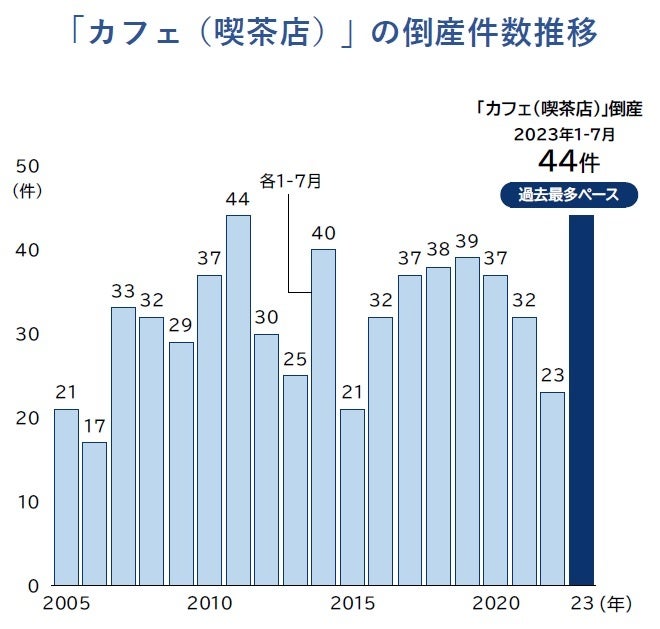 街のカフェで倒産が急増している。2023年に発生した「カフェ(喫茶店)」倒産は、7月までに44件発生した。22年通年の34件を既に上回っており、外出自粛や在宅勤務の急拡大で需要が急減したコロナ禍(20-21年)の水準も超えた。このペースが続けば、過去最多だった2020年(68件)を超える可能性がある。