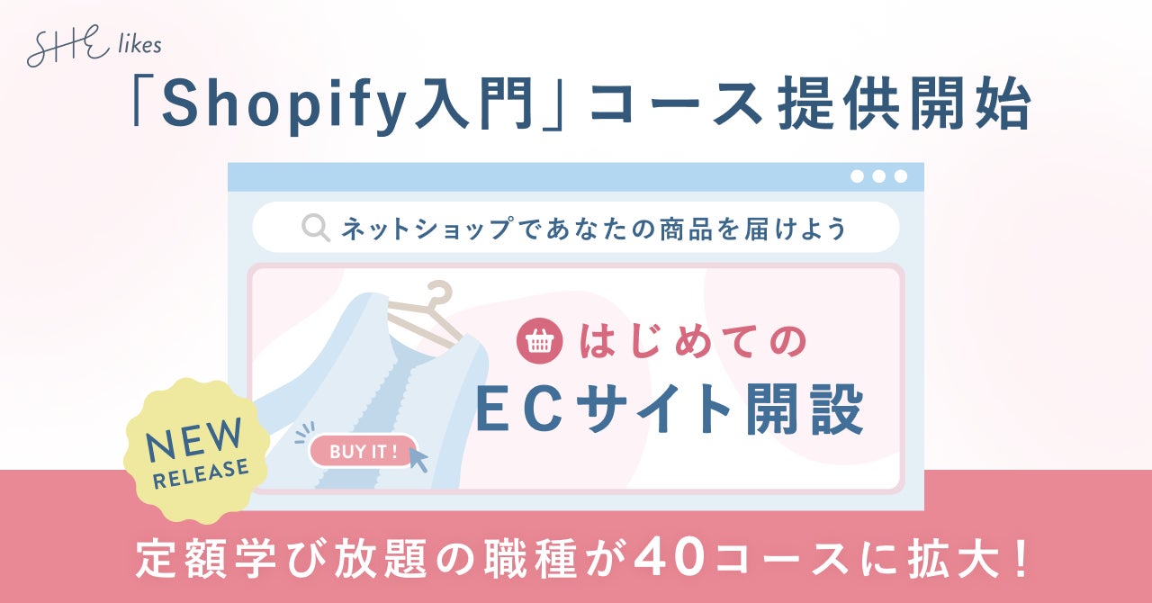 学びを仕事に活かすサポートをし、累計7万人以上が受講する女性向けキャリアスクール「SHElikes(シーライクス)」を運営するSHE株式会社(本社:東京都港区、代表取締役CEO/CCO:福田恵里、以下SHE)は、ノーコードで本格的なECサイトの構築ができるプラットフォームとして世界中で利用されている「Shopify」を使ってECサイトの基礎知識と制作が学べる「Shopify入門」コースをリリースしました。また、本コースの新設により、SHElikesで学べる職種が40コースに拡大しました。