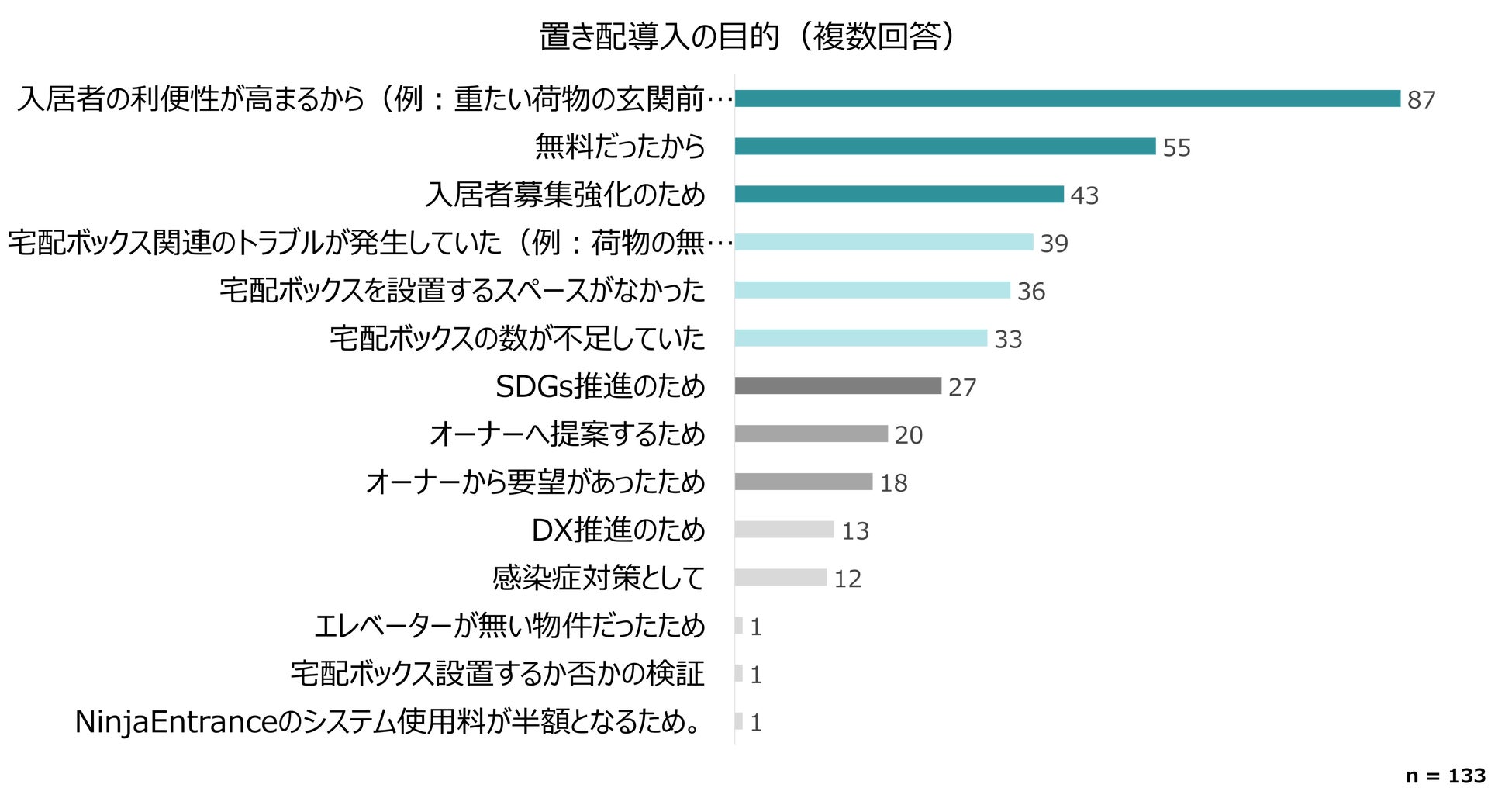 置き配サービスを導入した理由について「入居者利便性が高まるから」が9割、「導入が無料だったから」が約5割、「入居募集強化のため」「宅配ボックスの不足やトラブル改善のため」が4割となりました。当項目については、複数回答可として調査しました。
