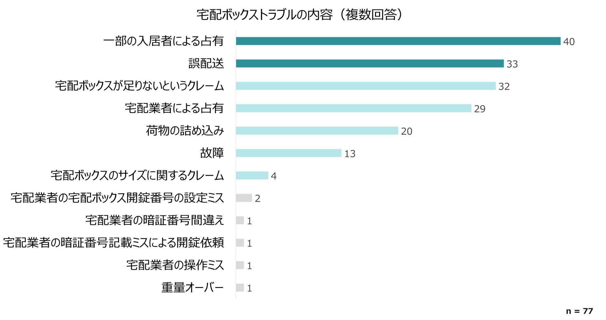 トラブル・クレームの発生原因は「一部入居者による占有」、「誤配送」「詰め込みなど不適切な使用」の順に多いことが分かりました。