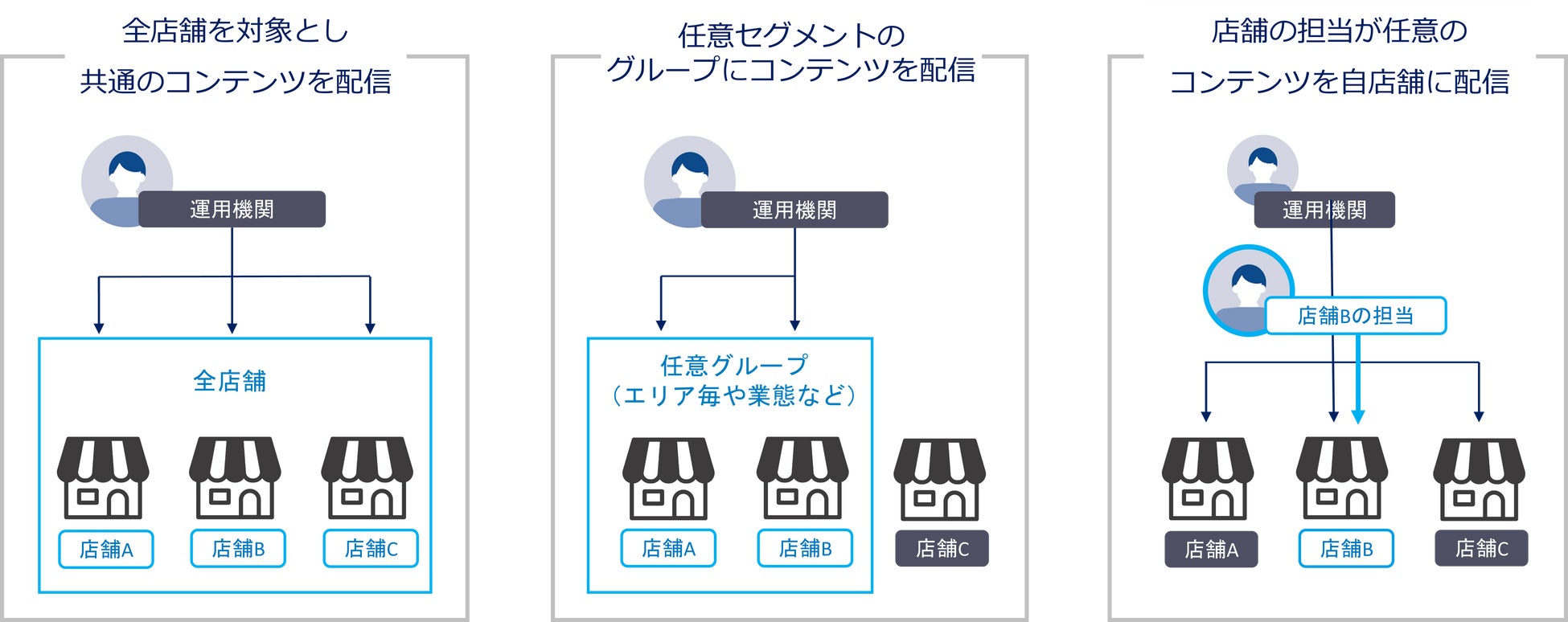 これにより、多店舗展開をしている企業は、本社、本部側などの運用機関と店舗側のコミュニケーションコストや煩雑なコンテンツ配信設定による工数がなくなり、効率的な顧客に対する販促活動や情報提供が行えます。