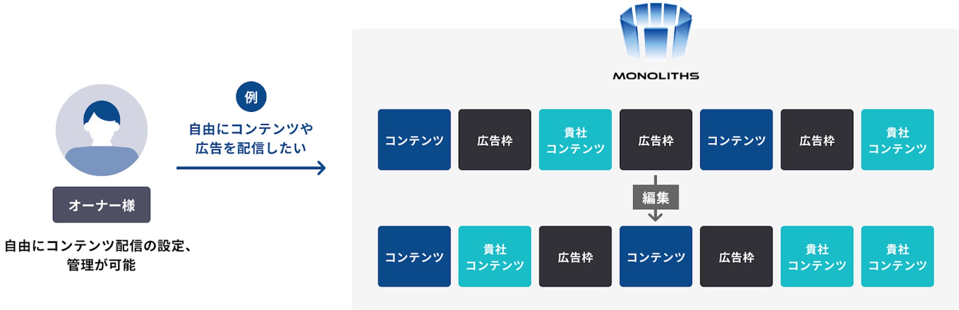 MONOLITHS Plusは、MONOLITHSで可能としている配信設定をより簡易的にする機能に加えて、各店舗単位で、店舗の店長やスタッフが任意に個別にコンテンツを配信できる機能を備えたオプションとなります。