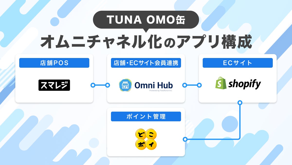 株式会社RESORT (本社所在地:東京都渋谷区東4-12-1 代表取締役 河野 裕太)は、この度、株式会社フィードフォース(本社所在地:東京都文京区湯島 3-19-11 代表取締役 塚田 耕司 以下、フィードフォース)と業務提携し、Shopifyスタートアップパッケージ「TUNA」の新たなオプションとして、フィードフォースが提供するオムニチャネル会員連携アプリ「Omni Hub」及びフィードフォースグループの株式会社リワイアが提供する「どこポイ」と連携したことをお知らせいたします。