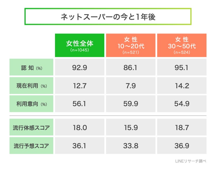 その結果「ネットスーパー」の流行体感スコアは女性全体で「18.0」で、およそ6人に1人が利用しているイメージを持たれていることがわかりました。