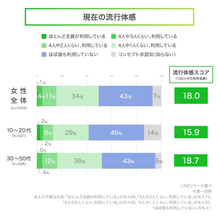 前回調査と比べると、女性全体の流行体感スコアは前回の12.0から、今回は18.0と増加しました。また、現在利用率の高かった30~50代では、前回が12.4、今回が18.7となり、いずれも6ポイント増加しました。