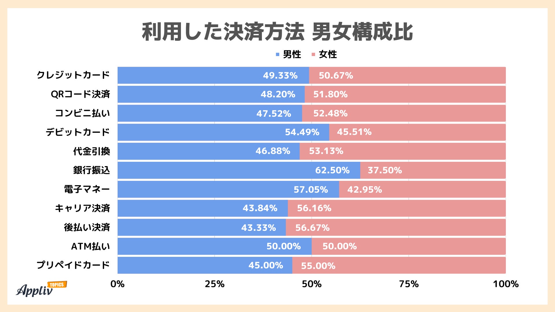 一方、「キャリア決済」「後払い決済」は女性の割合が大きくなっています。