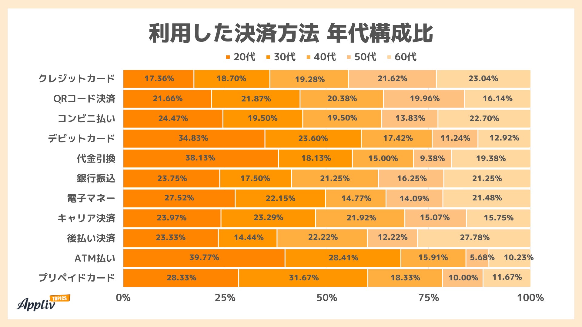 特徴的なのは「デビットカード」「代金引換」「ATM払い」「プリペイドカード」。20〜30代の割合が大きくなっています。