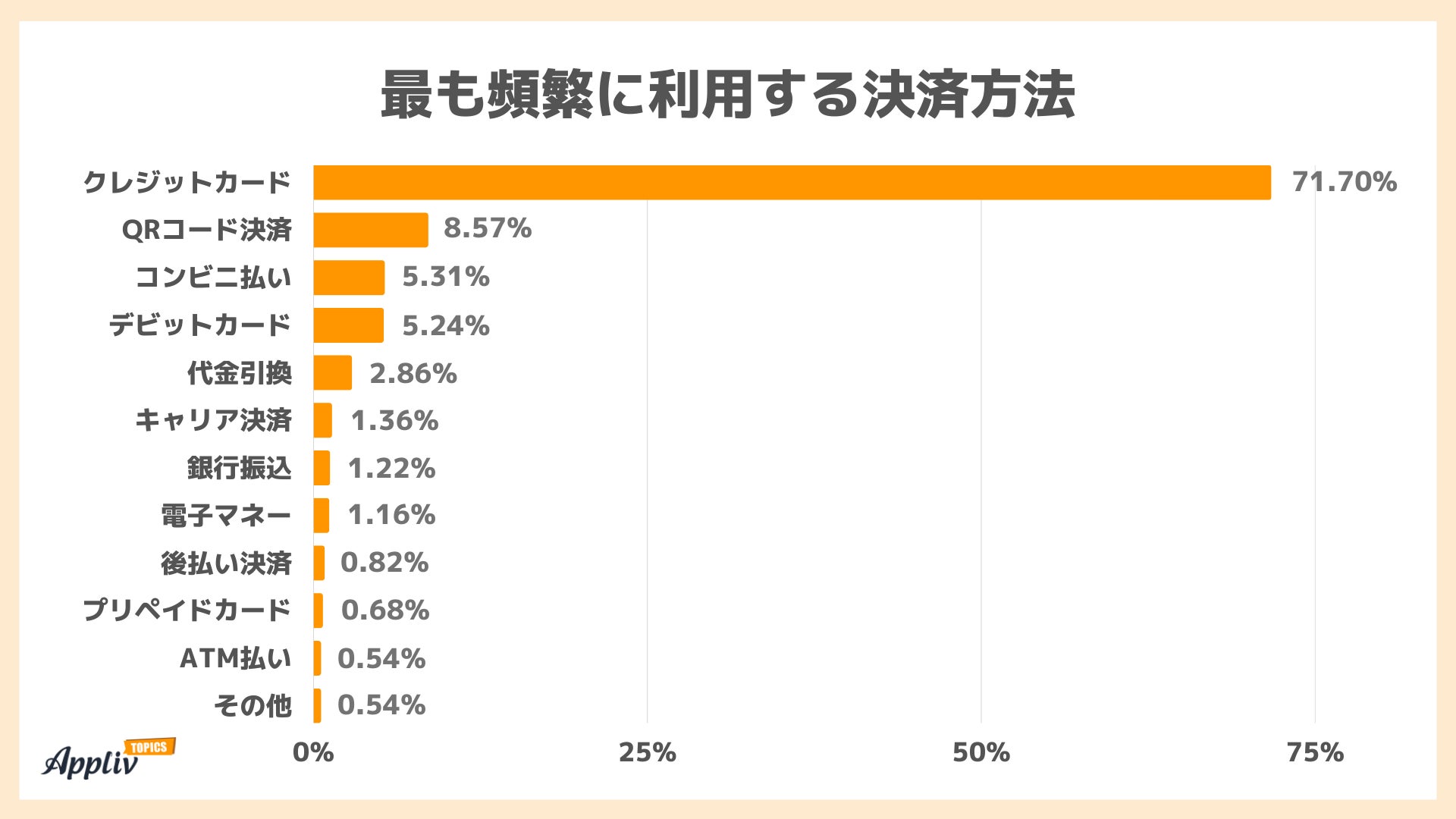 回答した中で最も頻繁に利用する決済方法を尋ねたところ、「クレジットカード(71.70%)」が圧倒的に多い結果となりました。