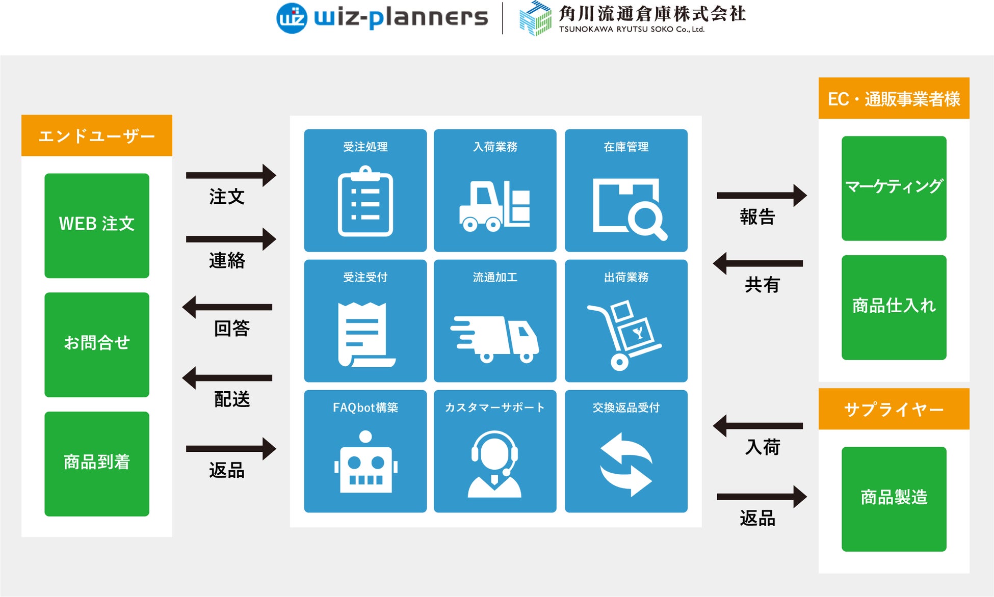 角川流通倉庫株式会社(本社:東京都足立区、代表取締役社長:角川 晃弘)と、ウィズ・プランナーズ株式会社(本社:東京都品川区、代表取締役社長:櫻井 琢也)は、両社の強みを生かした業務提携により、フルフィルメント全域をカバーするEC・通販事業者様向けサービスの提供を開始いたします。