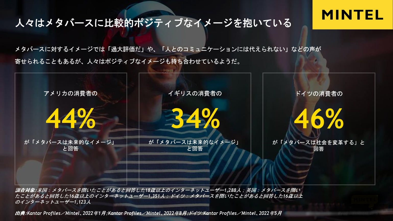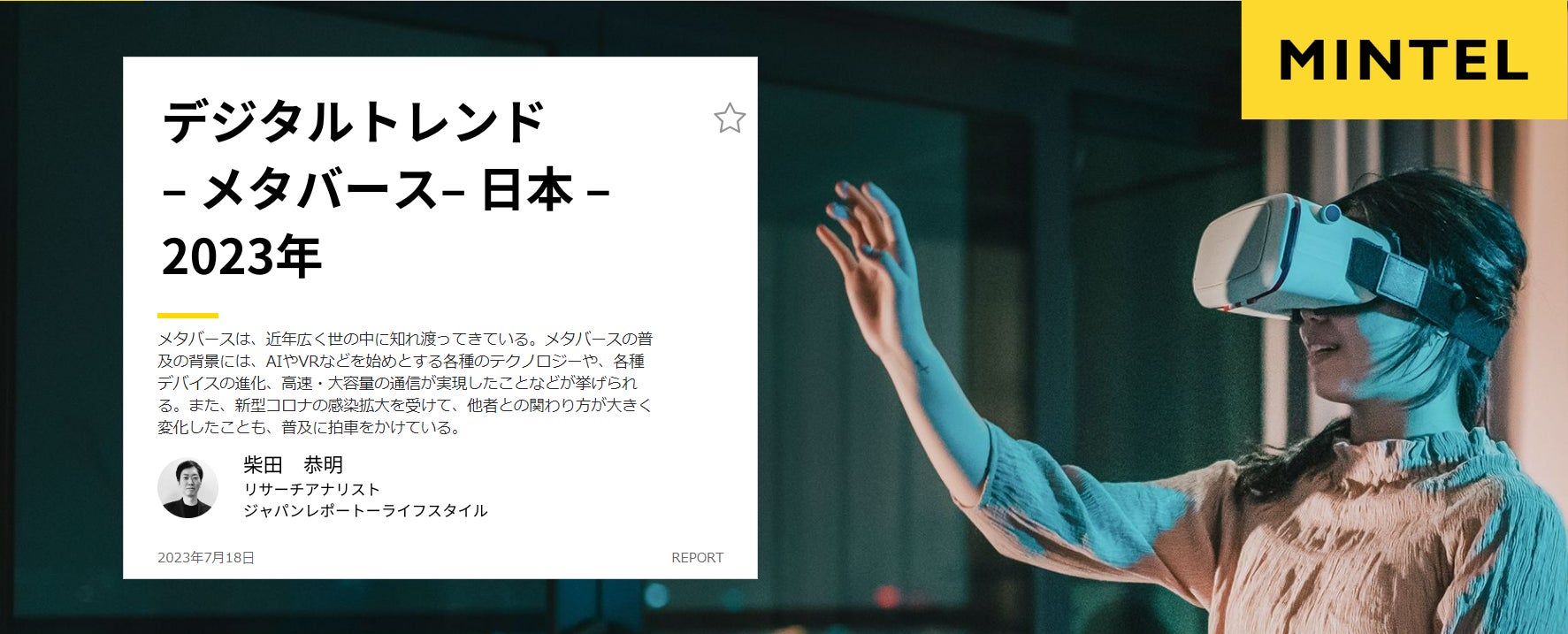 イギリス、ロンドンに本社を置く大手市場調査会社「Mintel(ミンテル)」は2023年7月18日(火)、ミンテルジャパンレポート*1より「デジタルトレンド – メタバース– 日本 – 2023年」と題したレポートを発刊しました。本レポートでは、近年注目されるメタバース普及の背景から一歩先を行く海外の概況だけでなく、ミンテル独自の調査に基づく消費者意識や日本での社会問題の解決につながり得る、今後の活用例について考察しています。