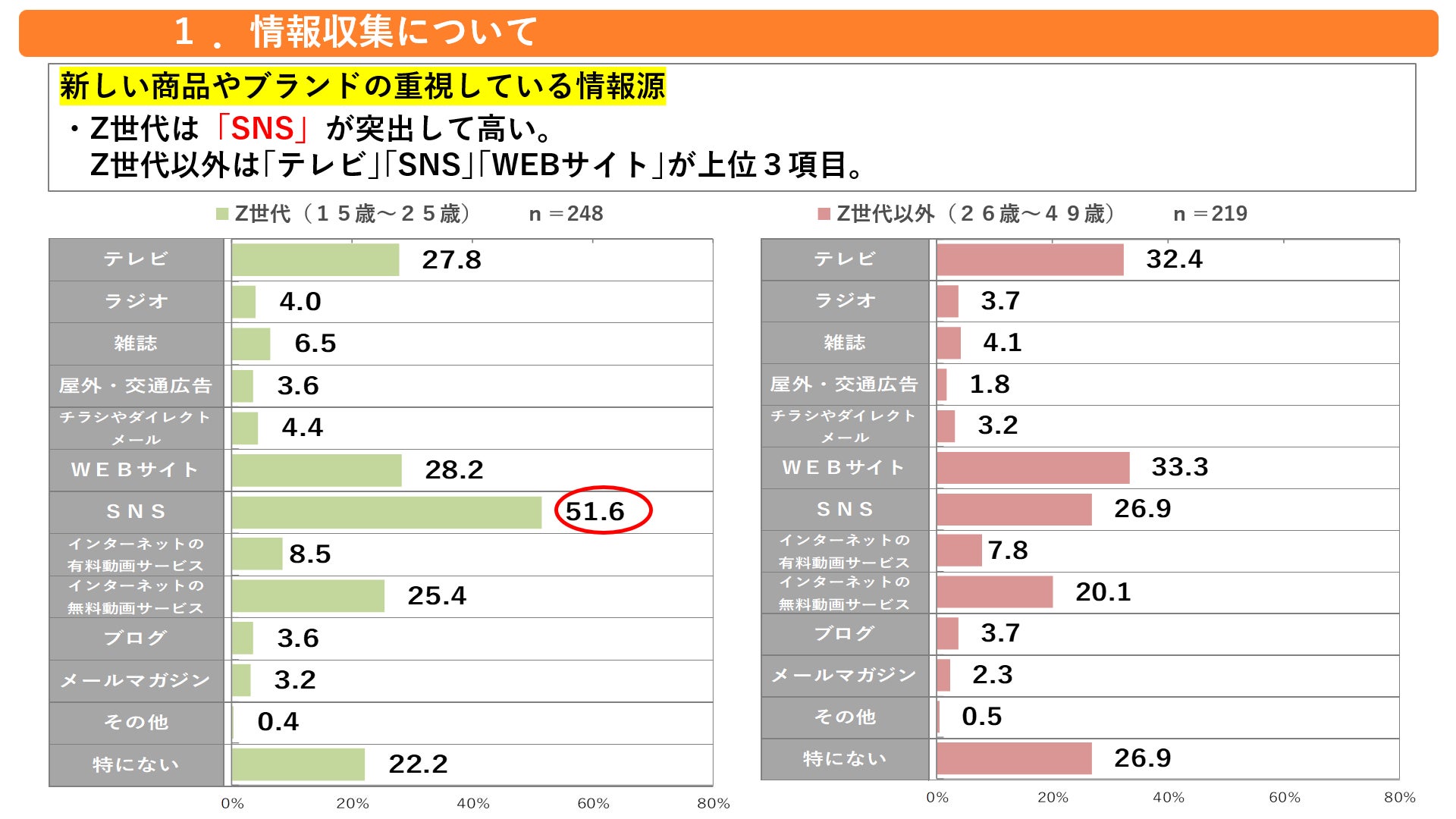Z世代が商品やブランド選択に最も重視している情報源はSNS(51.6%)。Webサイト利用は28.6%と振るわない。