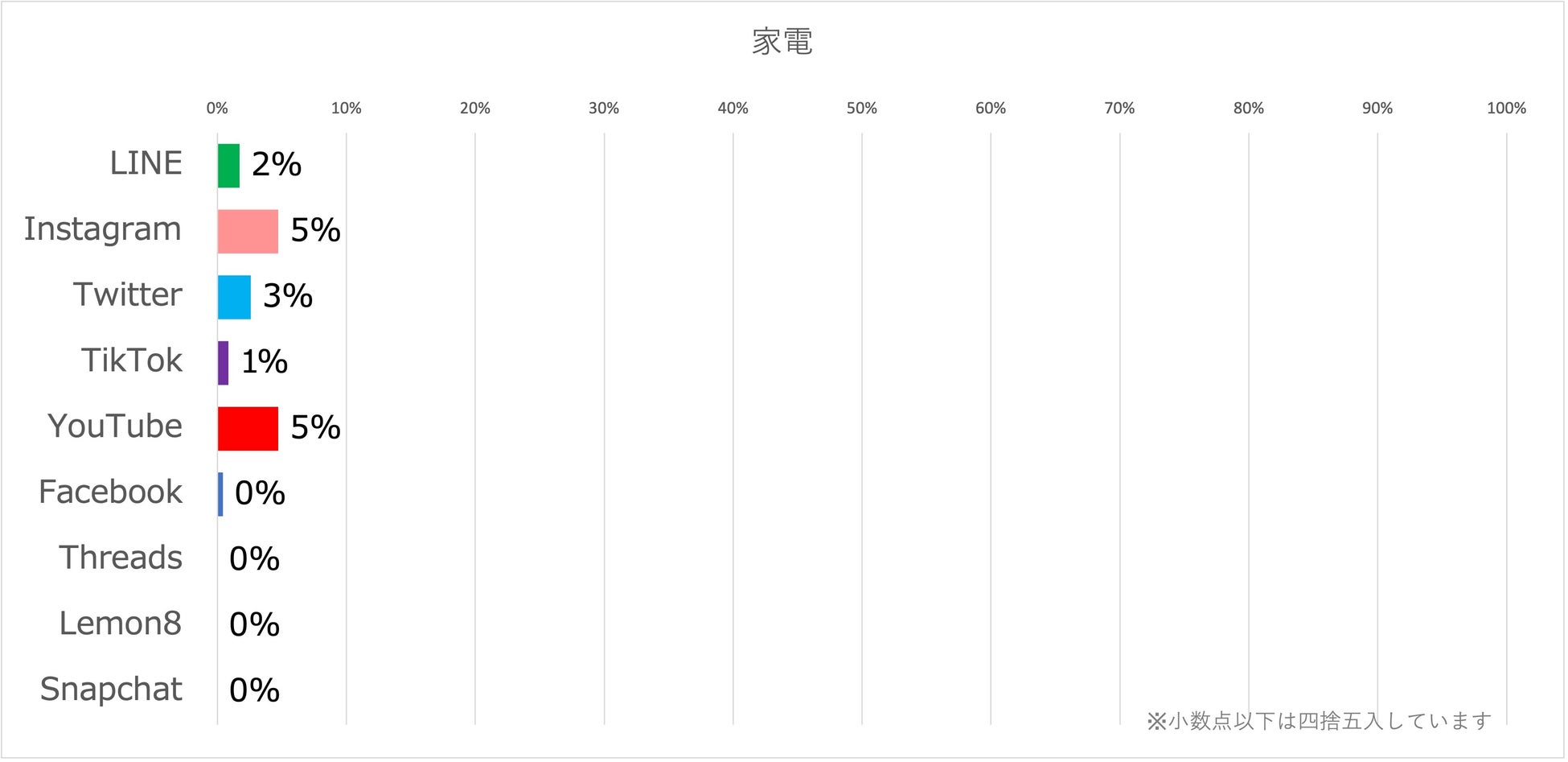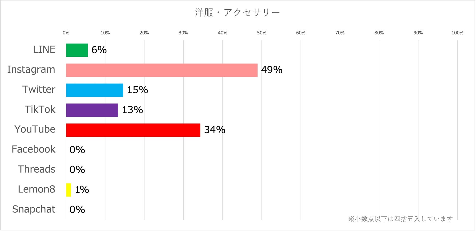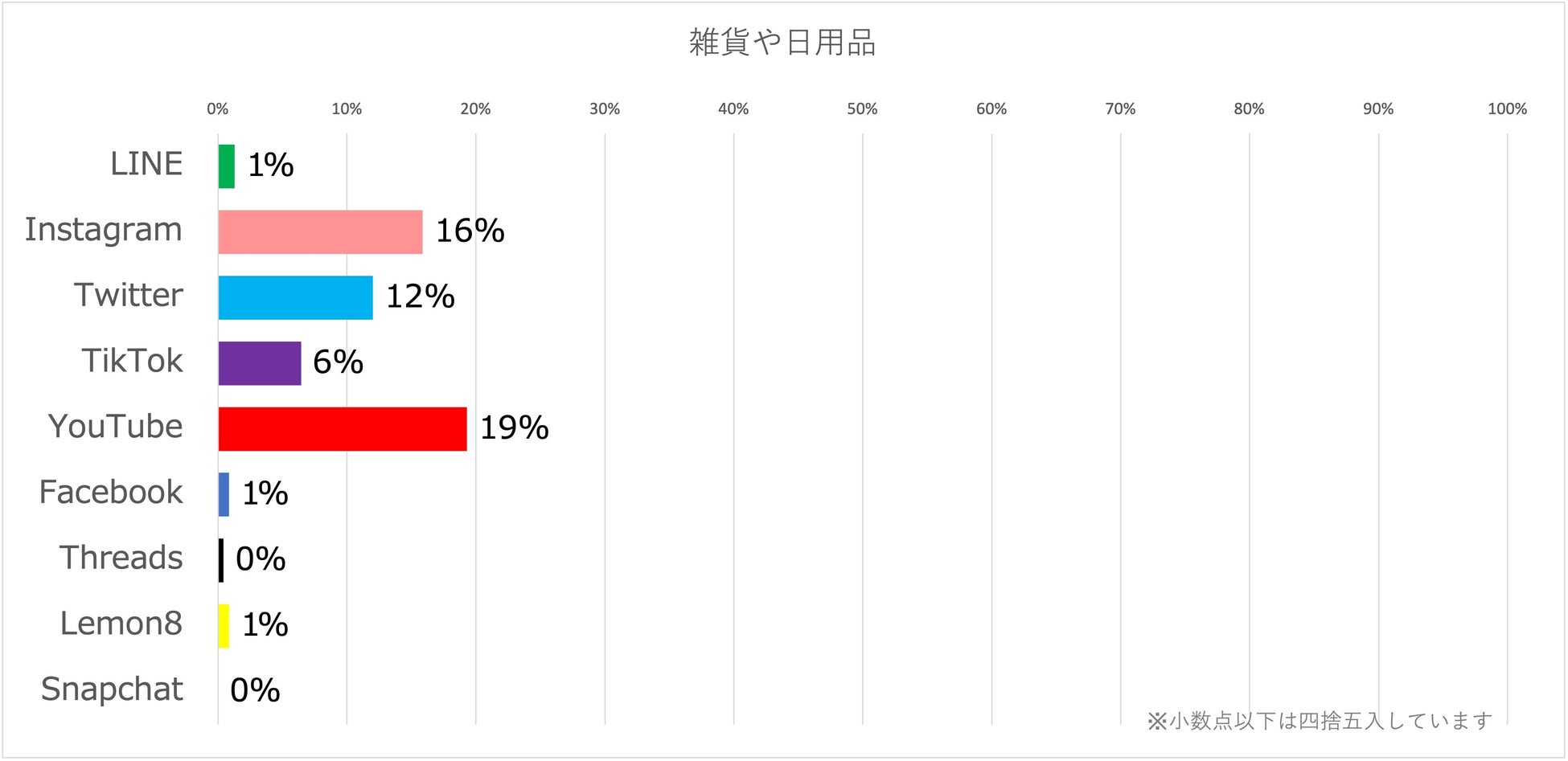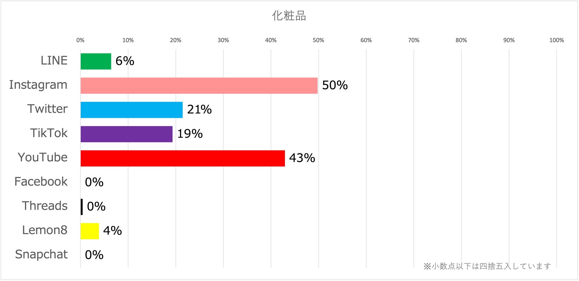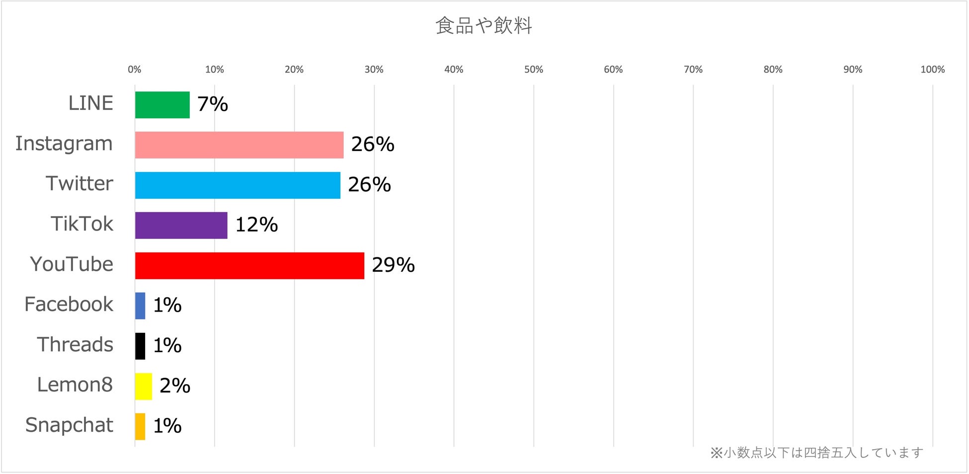 また、購入経験SNS調査してみた結果、「影響を受けるSNS・参考にしているSNS」の質問と同様に「Instagram」「YouTube」「Twitter」「TikTok」の順に購入割合が高い結果となった。