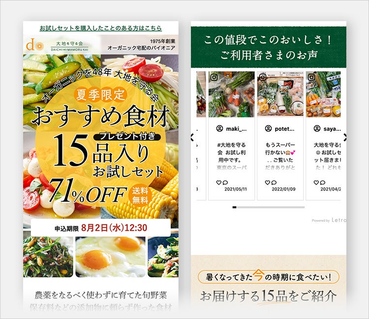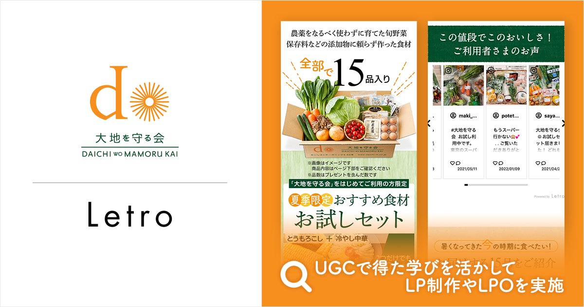 そんな中、獲得効率の抜本的な改善を目指すために、UGCから見えた「お客様の体験価値」をもとに新たな訴求のLP制作を検討。そこで、これまでUGC運用を通じて、大地を守る会の顧客を深く理解し、累計約15万件にも及ぶ新規獲得LPの運用改善を見てきたLetroと共に新たなLPを制作・運用するに至りました。