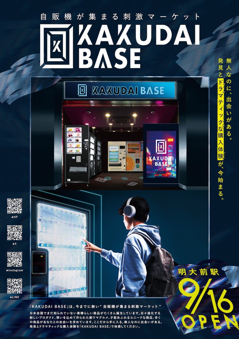 「KAKUDAI BASE」は自販機を複数台集めジャンルを超えたさまざまな商品が購入できる刺激的な空間店舗です。新しい発見からその場で瞬時に購入ができ、ちょっとした非日常体験とワクワク刺激を味わえるマーケットです。偶然に自販機の前に立ち止まったことで、今まで知らなかった素晴らしい商品と出会えた。あの商品が自販機で買えるという衝撃の驚き体験があった。今までに無い、自販機で購入できる新しい体験を味わって頂くことが出来ます。