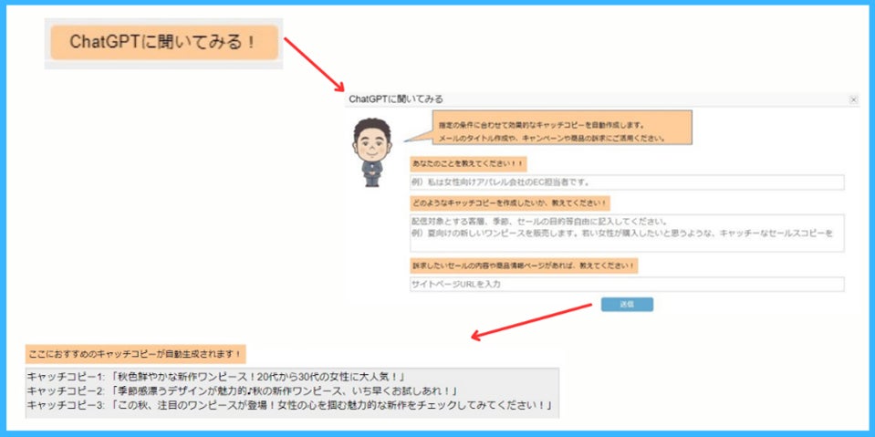 例えば、「あなたのことを教えてください!!」「どのようなキャッチコピーを作成したいか、教えてください!」「訴求したいセールの内容や商品情報ページがあれば、教えてください!」の3項目、現在の担当業務とターゲット、商品URLを登録し、あとはChatGPTの回答を待つだけでキャッチコピーを作ることが可能、非常にシンプルかつ簡単な機能です。また、LTV-LabのA/Bテスト配信機能と組み合わせる事により、キャッチコピーの効果の比較も簡単に可能です。