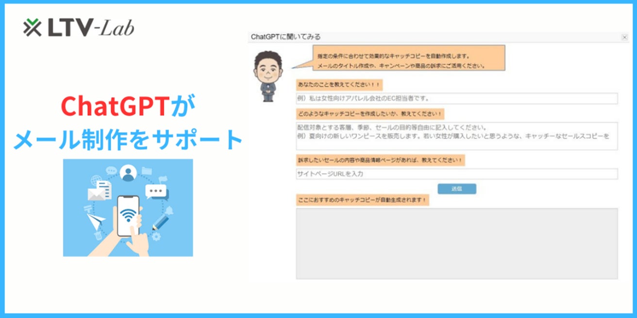 株式会社LTV-X(本社:東京都港区 代表:野口 学夫)が提供する『LTV-Lab』は、OpenAI社が提供するChatGPTを活用し、メール制作に必要な商品・サービスのキャッチコピーを生成する機能を搭載いたしました。これにより、商品・サービスをプロモーションする際のキャッチコピーを自動生成するため、EC運用担当者の新商品のアピール文章、メール制作に関する時間・業務工数の削減、パフォーマンス向上を実現します。