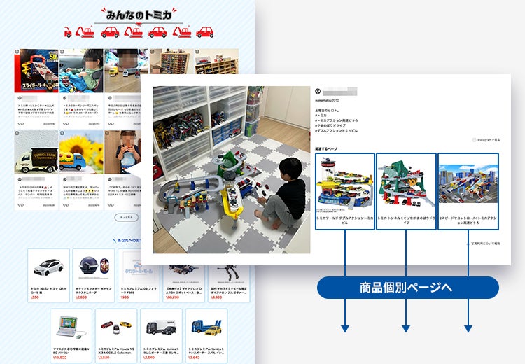 トミカやプラレール、アニアといった人気ブランドの公式 ECサイト「タカラトミーモール」内の各ブランド トップページに、Letroを活用してUGCを掲載しています。手始めに、サイトの訪問者の想定状態を踏まえてUGCで補足すべき情報を定義し、それらを表現するUGCをInstagram上から収集して掲載しました。入口となるTOPページには、実際に商品を手に取った際にわかる情報や子供たちが商品で楽しんでいる様子を視覚的に訴求することで商品に興味をもってもらい、商品サイトへ遷移させることを狙いました。