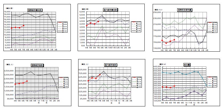 ●国内線については、新型コロナウィルスの5類移行以降後初めての夏休みシーズンを迎え、 発着回数は4,372回(前年同月比95% 、2019年同月比91%)、旅客数は69万人(前年同月比116% 、2019年同月比100%)と、コロナ禍前と同水準となっています。