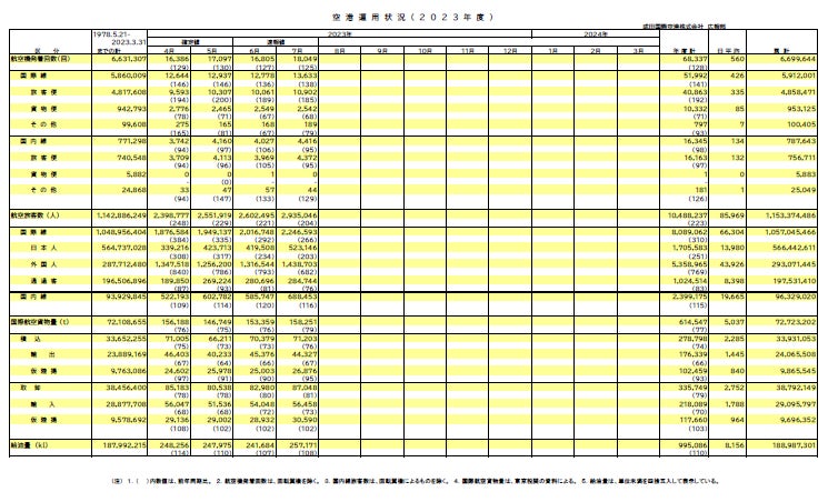 ●国際線については、引き続き韓国・台湾・香港をはじめとした近距離アジア線が好調で、旅客便発着回数は10,902回(前年同月比185%、2019年同月比69%)となり、3カ月連続で1 万回を超えました。旅客数は、225万人(前年同月比266%、2019年同月比70%)となりました。特に外国人旅客数が144万人(前年同月比682%)となり、コロナ禍前の9割に回復しました。日本人旅客数については52万人(前年同月比203%、2019年同月比43%)となりました。
