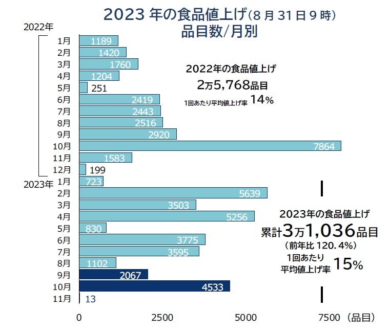 2023年通年の値上げ品目数は、既に実施されたものや今後予定するものを含め、累計で3万1036品目となった。22年通年の2万5768品目を既に上回り、年間累計としてはバブル崩壊以降で類を見ない記録的な値上げラッシュとなっている。ただ、8月末時点の判明分としては10月の値上げ(4533品目)が前年に比べ約6割の水準にとどまるほか、11月の値上げも前年より大幅に少なく、8月以降4カ月連続で前年同月を下回るとみられる。
