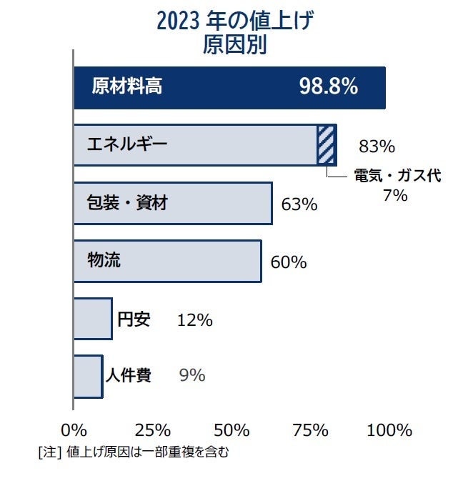 ただ、原材料価格の下落を理由とした「値下げ」は僅かにとどまり、食品価格は高止まりの状態が続く。原油・ガソリン価格の上昇を背景に物流費やプラ製包装資材などではコスト増が続くほか、不透明な電気・ガス代の動向、1ドル=140円台の円安水準が長期化していることで輸入品価格の上昇も今後想定され、24年以降に値上げが持ち越される可能性もある。