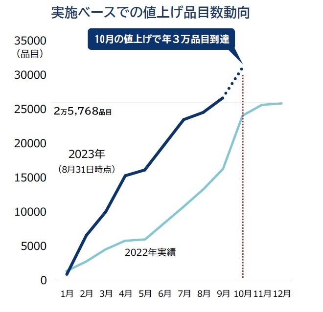年内の値上げは、急激に値上がりした前年の原材料価格の上昇分を販売価格に反映できた企業が増えていることから10月を最後に一旦ピークアウトし、最大で22年比1万品目増の3万5000品目にとどまるとみられる。
