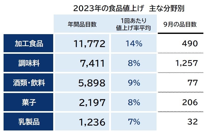 2023年9月の値上げは、「調味料」(1257品目)が全食品分野で最多だった。みそ・しょうゆ、だし関連製品などが値上げ対象となる。「加工食品」(490品目)は、チルド・冷凍食品や乾麺製品、肉製品などが中心だった。「菓子」(206品目)は、柿の種やチョコレート菓子、アメ、マルチタイプの氷菓製品など幅広い品目にわたった。