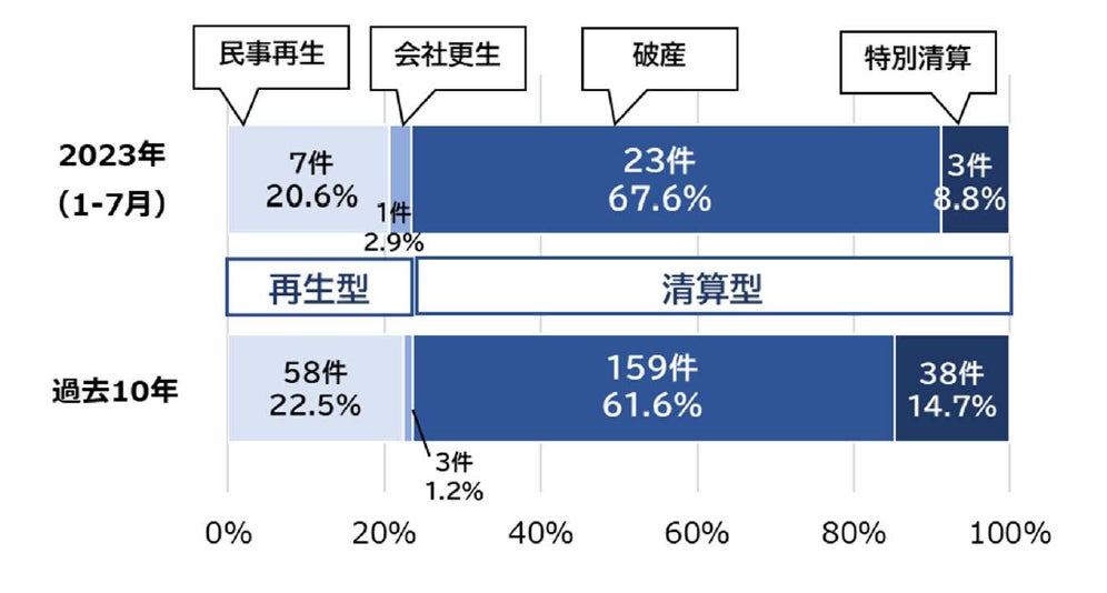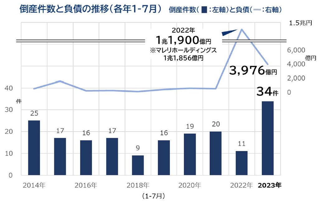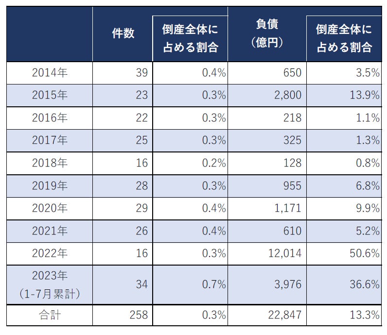 なお、各年の1-7月で比べると、2014年の25件を大きく上回り、2023年(34件)は過去最多。負債総額は、通年と同じく2022年に次ぐ過去2番目の水準となっている。