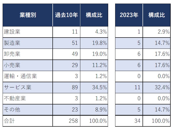 2023年(1-7月)のファンド出資企業倒産を業種別にみると、最も多いのは「サービス業」の11件(構成比32.4%)。次いで「小売業」「卸売業」が6件(同17.6%)で並んだ。過去10年の累計と比べると、コロナ禍の影響を大きく受けた飲食店を含む「小売業」の割合が高くなっていることが分かる。