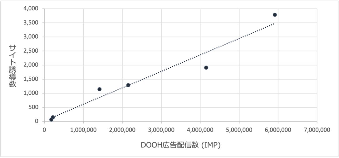 下記のグラフはエリアごとのDOOH広告の広告配信数とサイト誘導の関係をプロットしたものである。これを見ると、明らかな正の相関が見て取れる。DOOH広告にはサイト誘導効果があることが確認できた。