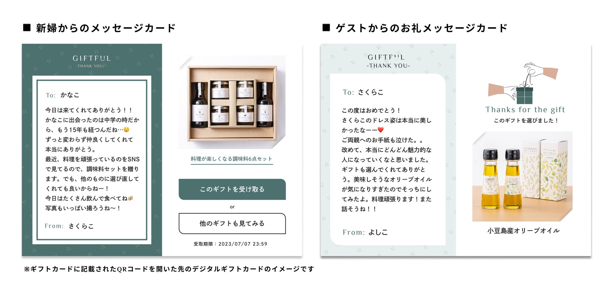 ゲストは、感謝の気持ちや挙式の感想などをデジタルメッセージカードで返信することが可能です。ギフトを渡して終わりではなく、ギフトを起点に、あたたかなコミュニケーションが生まれることを大切にしています。