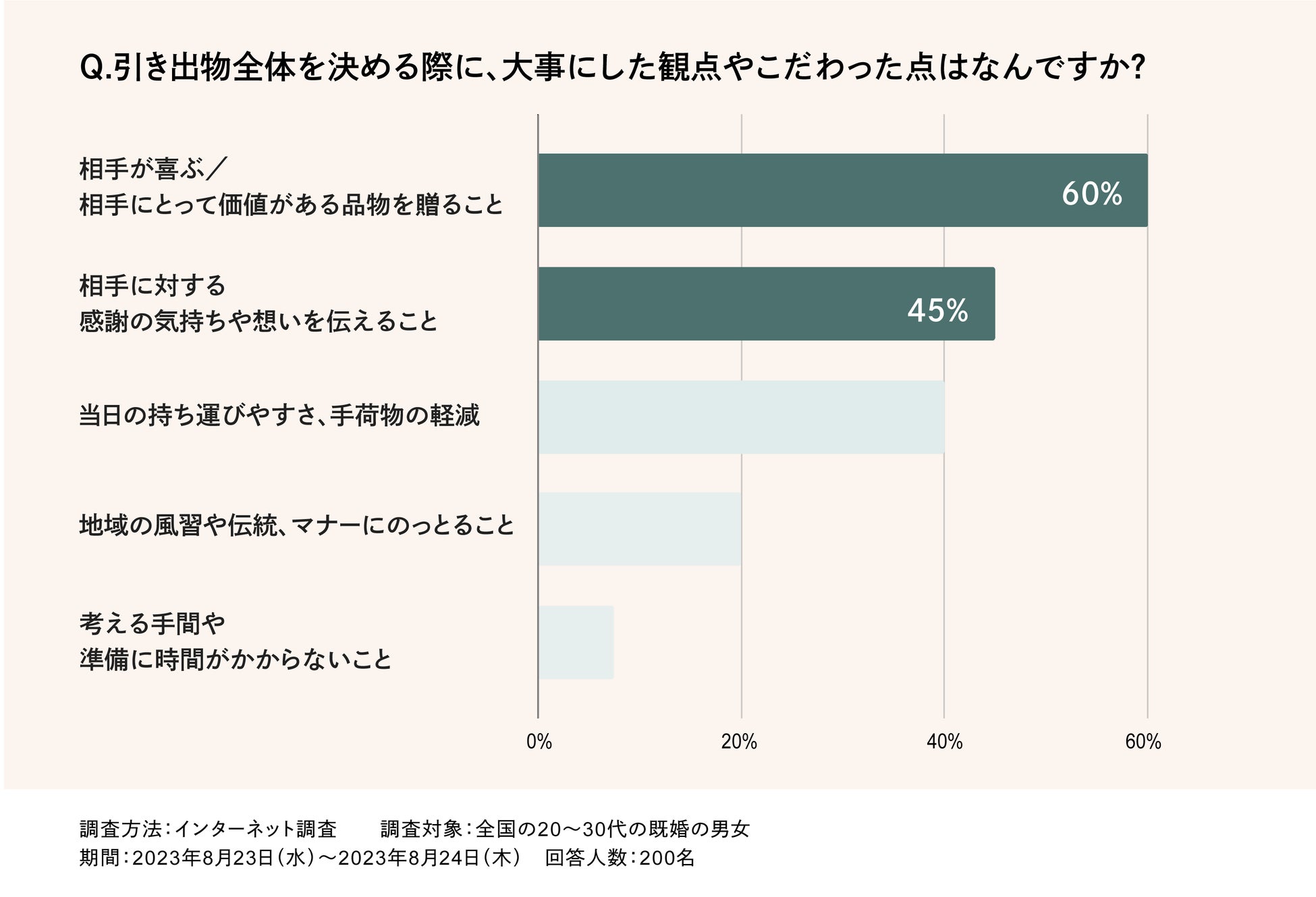 実際に結婚式をあげたことがある方を対象とした引き出物に関するアンケート調査でも、引き出物を選ぶ際にこだわった点は「相手が喜ぶ/相手にとって価値がある品物を贈ること」を選んだ方が1番多くて60%。「相手に対する感謝の気持ちや想いを伝えること」を選んだ方が45%。どちらかを1つでも選んだ方を合わせると全体の85%となりました。