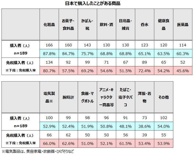 今回の調査参加者の中で、「日本への旅行経験あり」と回答した人(189人)のうち、そのほとんどが海外旅行時に免税手続きを行ない、商品を購入したことがあることがわかりました。