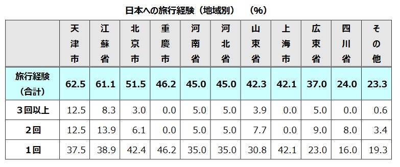 地域別にみると、日本への旅行経験の比率は、天津市が62.5%、江蘇省が61.1%、北京市が51.5%と半数を超える高い数値でした。一方で、内陸部にある四川省は、成田までの飛行時間が5時間を超えることなどから、24.0%と最も低く、回答者全体の36.6%よりも10pt以上低い数値でした。