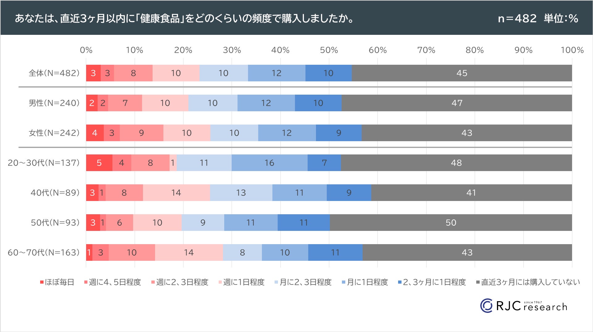 半数以上が3か月に1日以上、健康食品を購入しており、多くの人が普段の生活に健康食品を取り入れている様子がうかがえる。性別、年代で多少のばらつきは見られるものの、2~3割弱は週に1回以上と高い頻度で健康食品を購入している。