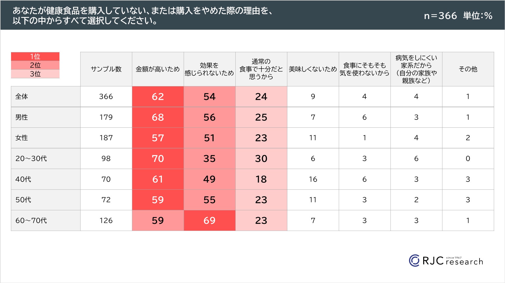 健康食品を購入しない、購入をやめた理由は、 「金額が高い」 「効果を感じられない」 が上位に挙がっている。金銭的な負担感を感じる割合は若い年代ほど多く、効果への不満を示す割合は上の年代ほど多くなっている。
