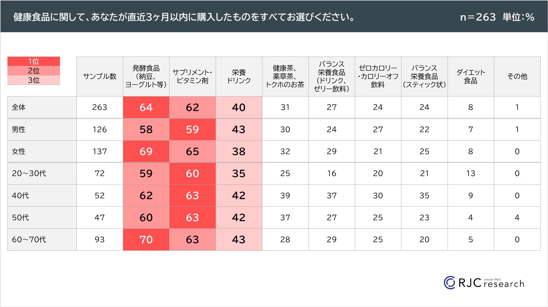 直近3か月で購入した健康食品は、 「発酵食品(納豆、ヨーグルト等)」 「サプリメント・ビタミン剤」 「栄養ドリンク」 の割合が高い。1位、2位の順位の入れ替わりはあるものの、性別、年代別でも同様の傾向がみられる。