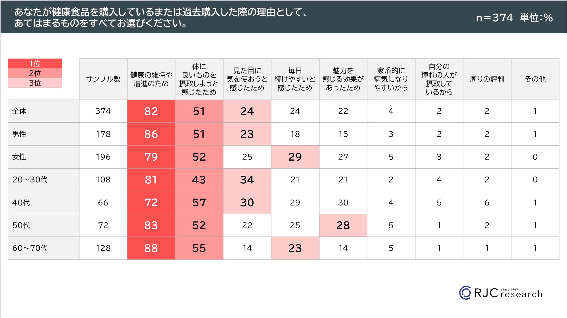 購入理由は、性別・年代問わず 「健康維持・増進のため」 「体に良いものを摂取」 が上位に挙がっている。 「見た目に気を使って」 は男性と40代以下の層、 「毎日続けやすい」 は女性と60~70代の層で上位に挙がり、性年代によって購入のポイントが若干異なっている。